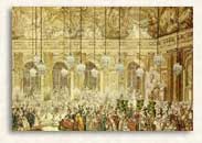 On avait donné une attention particulière à la préparation du buffet qui était placé aux deux extremités de la Galérie des Glaces et près de lescalier des Ambassadeurs: ces buffets devaient être consommés pendant les premières heures du vendredi; ils offraient un vaste menu de maigre , qui comprenait une grande variété de poissons, coupés en tranches ou composés en paté, des fruits frais et de la confiture. Le Salon dHercule, où lorchestre principale sonnait, au contrair était dédié au bal. Cet appartement, tapissé en tissu damassé rouge peu de temps avant, était éclaré par des girandoles en pure argent, et une des celles desparut très probablement dans les poches de quelque hôte habile, parmi lesquels on pouvait compter aussi des personnages illustres comme le prétendent au trône dAngleterre Charles Édouard.