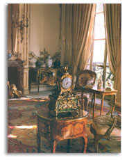 On remarque dans l'angle de la salle une très belle encoignure, d'une paire, estampillée de l'ébéniste Latz et, au premier plan, une table à écrire de Delorme, accompagnée d'une paire de fauteuils à la reine, superbes exemples de sièges Louis XV.