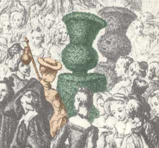 | It is reported that Madame Pompadour was the only one guest at the masked ball, dressed like shepherdess. She is recognizable by the detail of the stick, which was used by shepherds actually, while talking to the King who wears the yew-tree mask. |