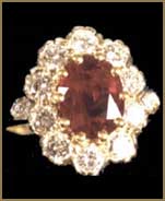 Ring Pompadour (Bague Pompadour). It forsees a central oval-shaped ruby, sapphire or emerald, surrounded by small diamond-cut brilliants. |